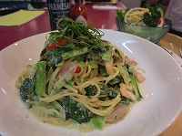 「小松菜丼」は"まかない飯"です。従業員の間で人気の一品だったものを、今回特別にイベント期間限定メニューとして出されることになりました。 小松菜と豚肉を炒め、しょう油で味付けをしたあんかけが、ピカピカの白いご飯の上にのっています。 口に入れると、濃い目のしょう油味にショウガが効いていて、ついつい口にかきこんでしまいたくなる味です 「小松菜スパゲティ」も、小松菜をふんだんに使った一皿。生の小松菜の葉と生クリームをミキサーにかけて作ったソースをからめたスパゲティです。